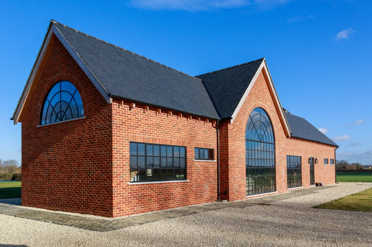 This private swimming pool and gym building utilises the narrow sightlines of our W20 doors and screens to allow lots of natural light into the space. The design also called for dramatic arched windows, which we created to complement the other casements. We used shaped head and glazing bars, and finished everything with a black (RAL 7021), marine-grade powder coating to withstand the humidity of the pool area.